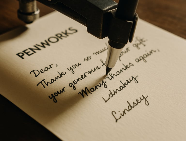 Every Penworks note is crafted with real ink and a genuine pen stroke. Our robotic precision ensures results that feel warm, authentic, and truly handwritten.